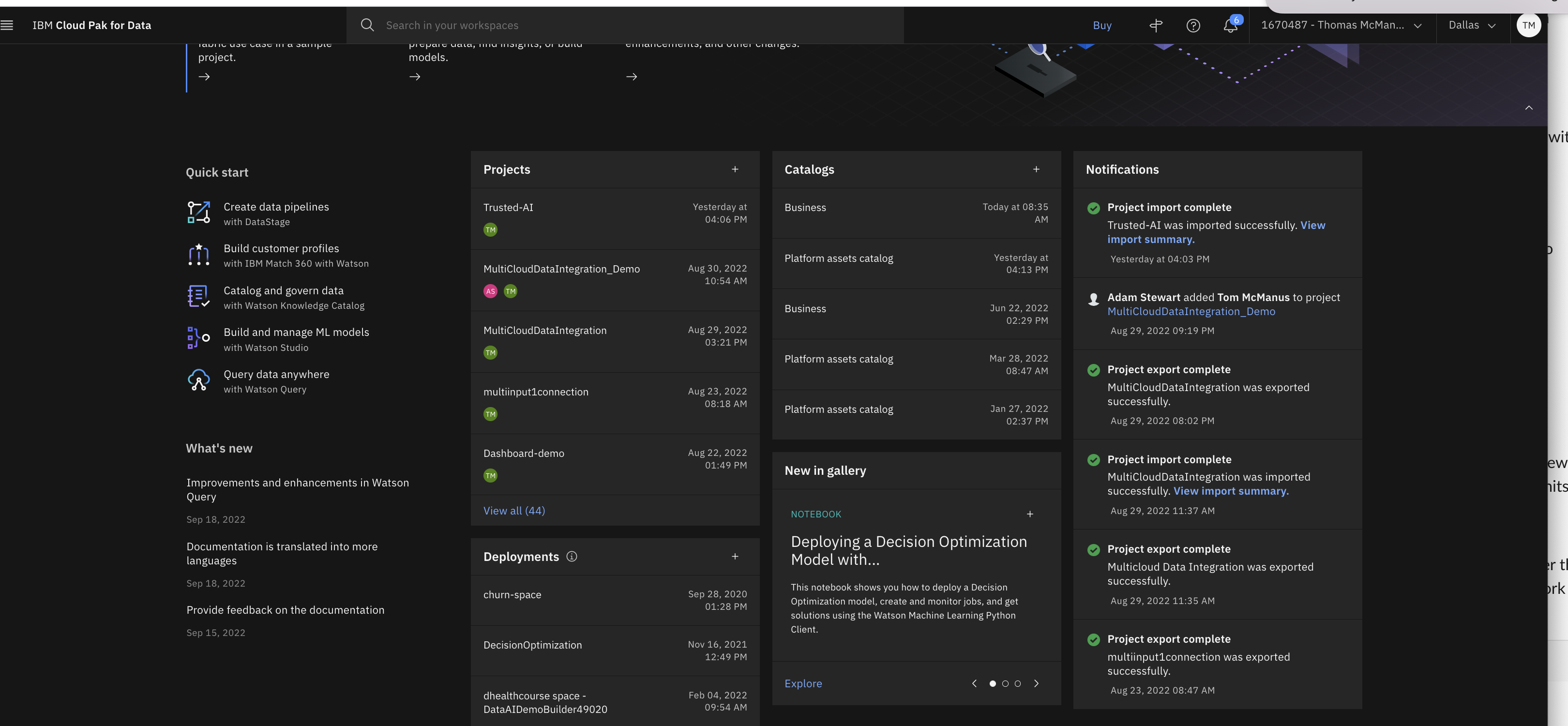All of my artifacts (Projects, Catalogs, Notifications, etc) from every account are visible to me from the cpdaas control plane regardless of the account I have selected. This is very hard to mentally deal with as I click an asset and the account switches and I am work there. I am I'm in account A and want to add something to a catalog and I get a list of catalogs from every account. I happen to have 40 accounts that I have been added to. I can see this becoming a big issue with Enterprise accounts. I also assume when this is moved to AWS that it will have similar issues around account tenancy.