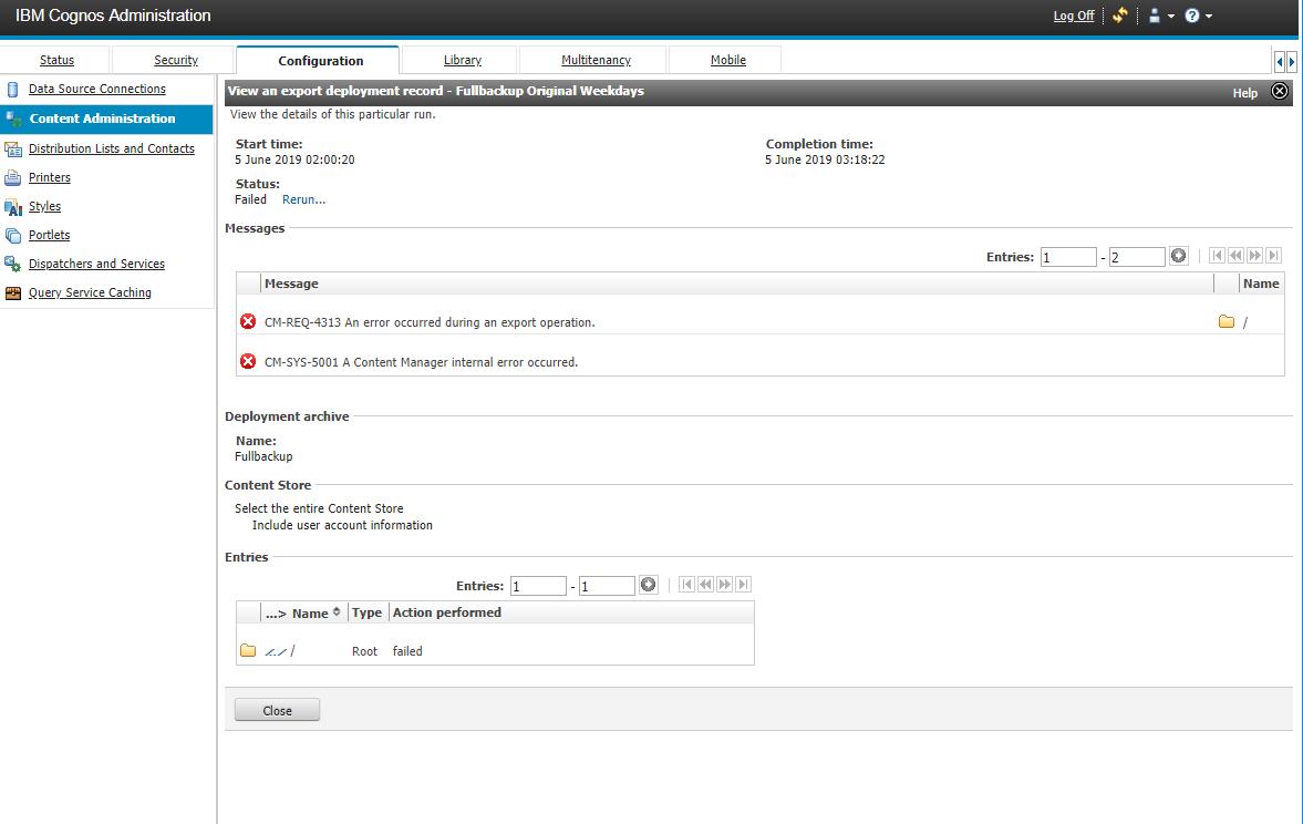 There is very limited information available when an export of the content store in the admin console failed, even when the "trace" option is enabled in the job. It is when you run a job in IBM Cognos Administration > Configuration > Content Administration > export content job. (see attachment).