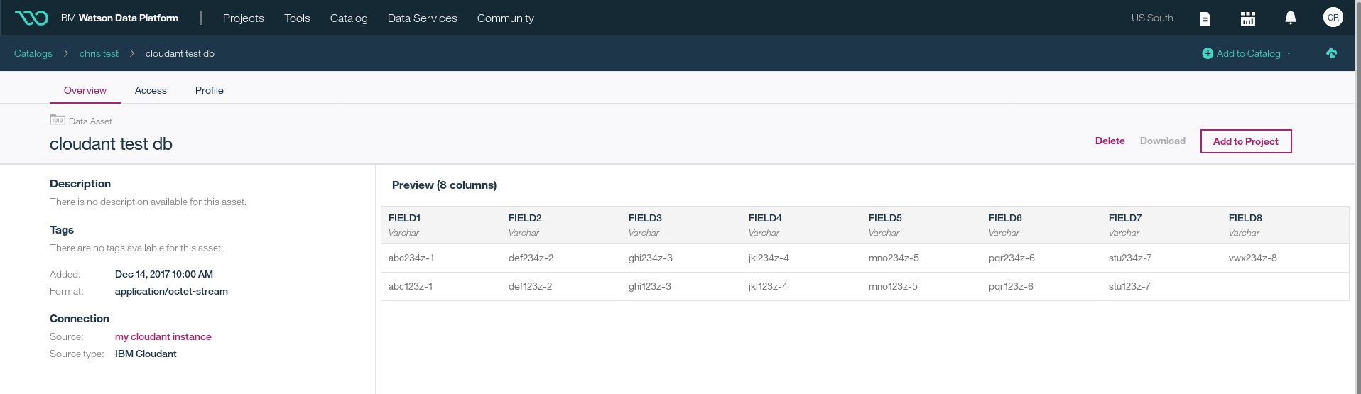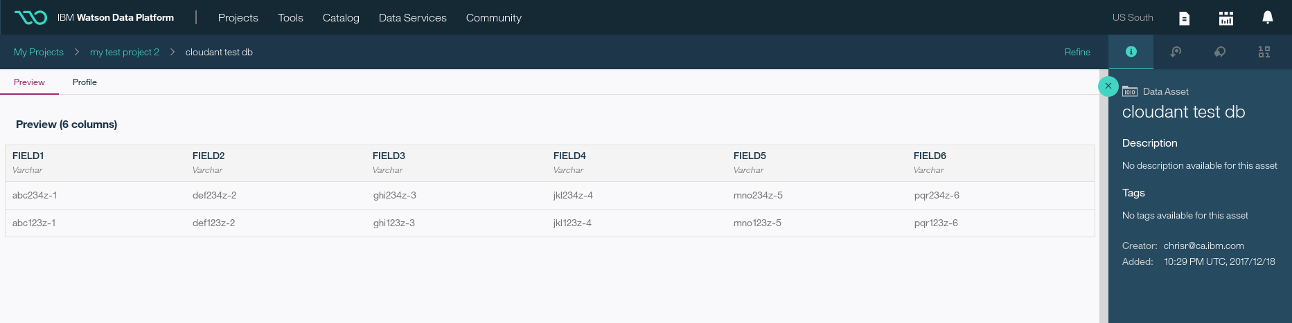 Continuing my last comment, see how the data catalog preview shows one document with 8 fields, and one with 7 fields, while the project preview shows both with 6 fields. Initially, when I created both the project data asset and the data catalog data asset, both documents had 6 fields. I then modified the documents in the cloudant database to 7 and 8 fields respectively. The data catalog data asset preview automatically shows the changes, while the project data asset preview does not. I have to recreate the project data asset to pickup the schema changes when working with projects, but now with data catalogs.