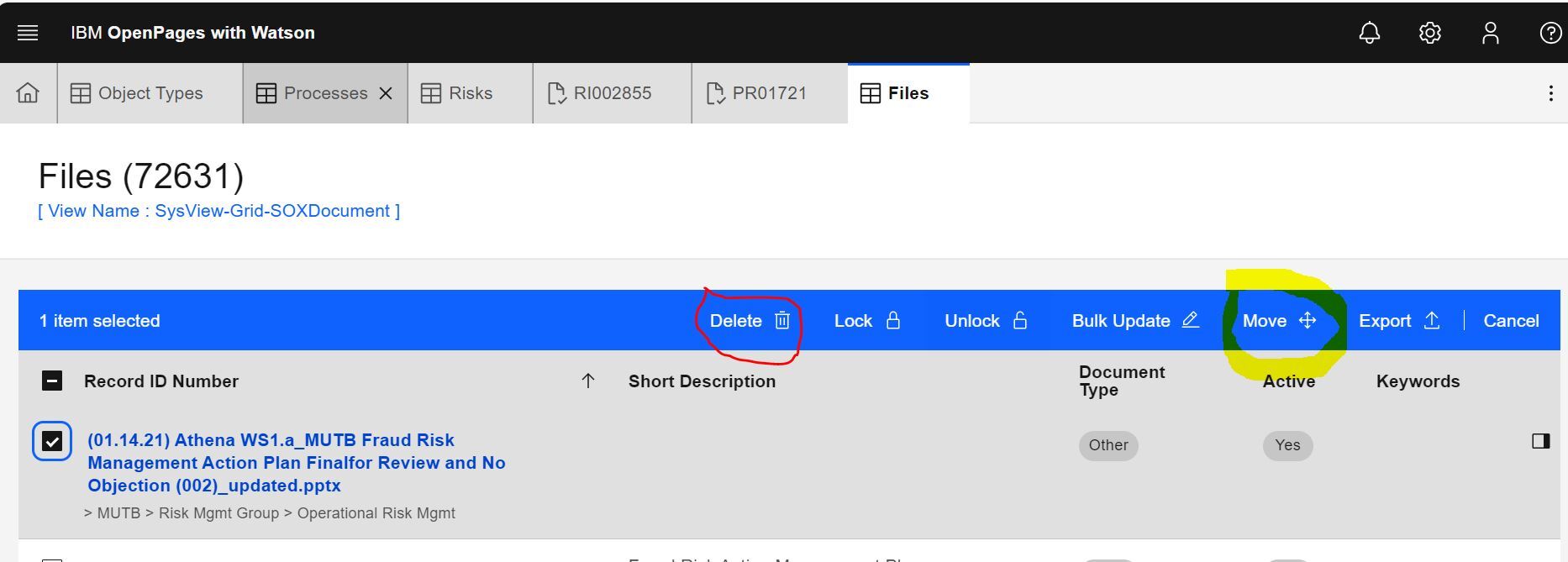 I have a business requirement where I need to give access to move the file (under attachments->file object) from one folder to another. In grid view, I want to show only this option: Move. But it is currently showing Delete and Move both options in the grid header. Can you please tell me how to achieve only showing the Move button for end users.