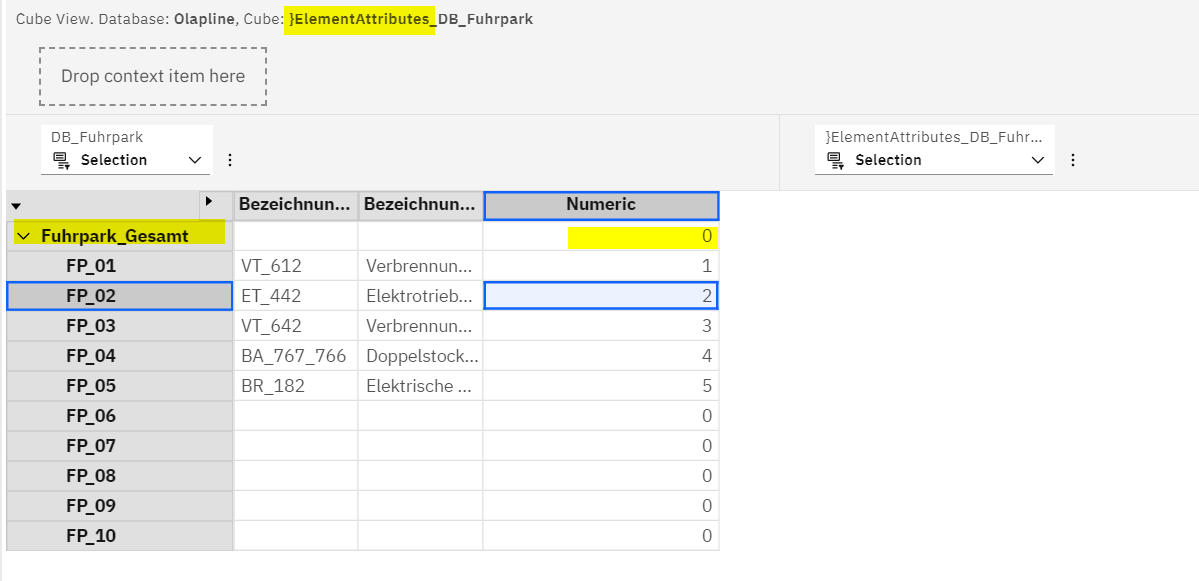 dimension DB_Fuhrpark with some elements and sum-element and also a numeric attribute "Numeric".