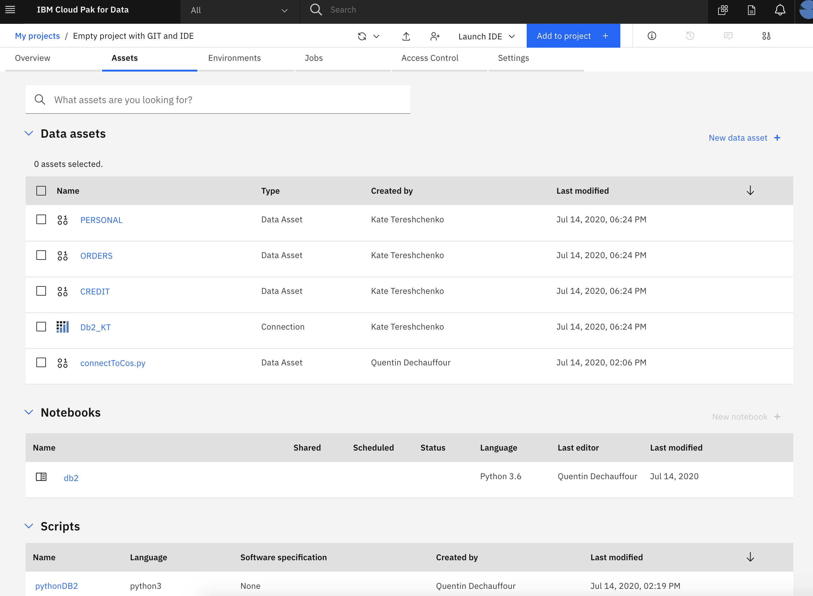 Using Cloud Pak for Data 3.0, Watson Studio. Created a project from new with git integration and JupyterLab IDE enabled.